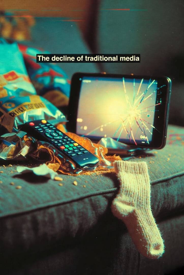 Messy couch with broken phone, melted remote, and lone sock. VHS glitch vibes.
